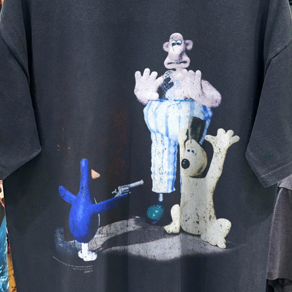 • 1993 WALLACE AND GROMIT 'THE WRONG TROUSERS' PROMO RARE WASHED BLACK T-SHIRT
